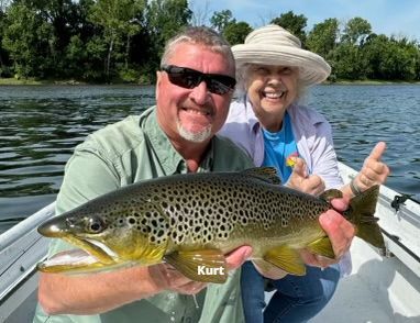 Calvin landed this 38-pound, 7-ounce, 36 1/2 inch brown wading from the river bank at Rainbow Drive Resort fishing the Rainbow Hole, which is located in front of Rainbow Drive Resort using a bass rod with 15 pound test line and a Mepps Comet Mino Spinner.